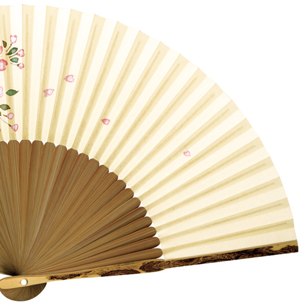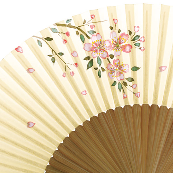 国内の産地から選りすぐった竹を扇骨とし、あたたかみを感じる色合いの京都東山の扇子用和紙に、京都の絵師が真心を込めて優美な桜を描き込みました。