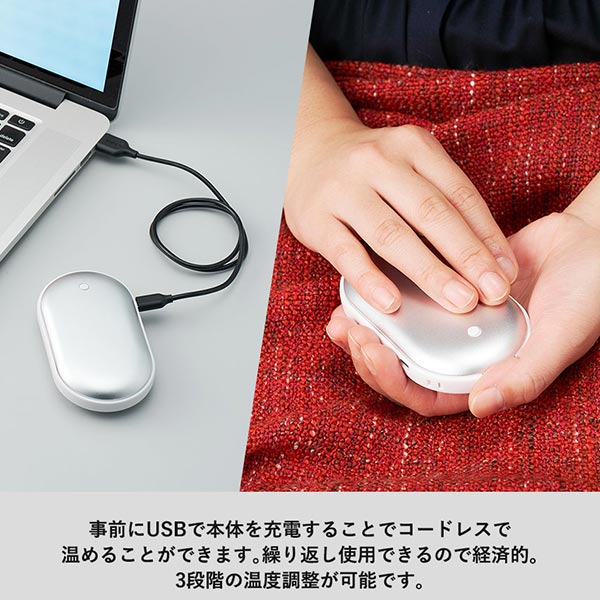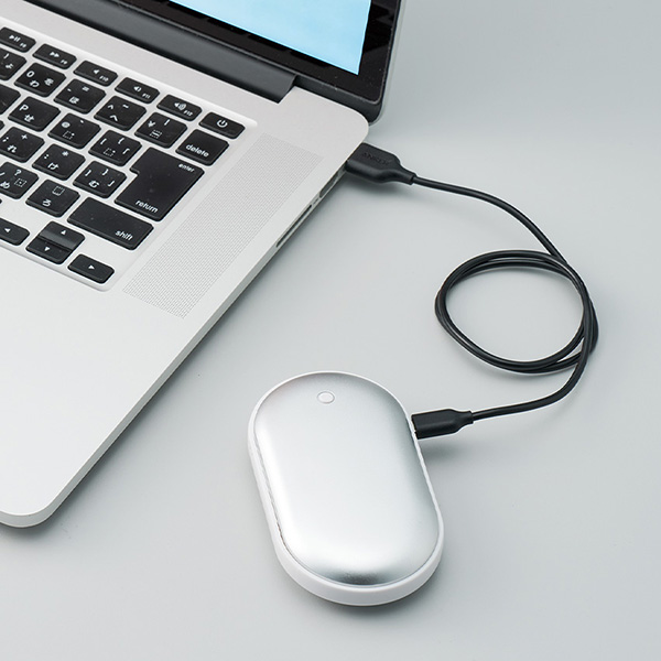 事前にUSBで本体を充電しておくことで、コードレスで温かくご使用いただけます。