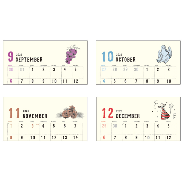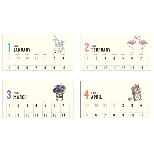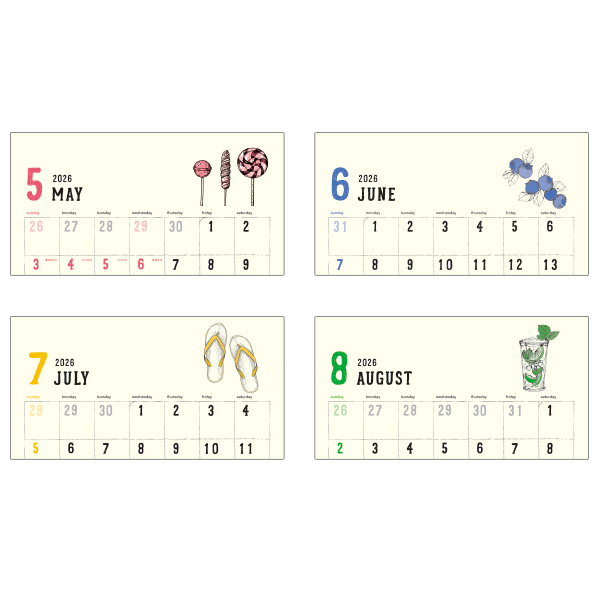カレンダー上部にスケッチ画を配し、月ごとに休日色が変わるカラフルなデザインです。