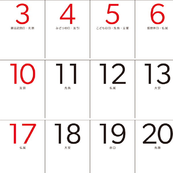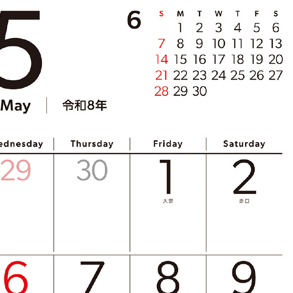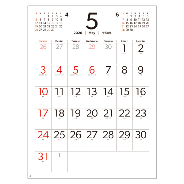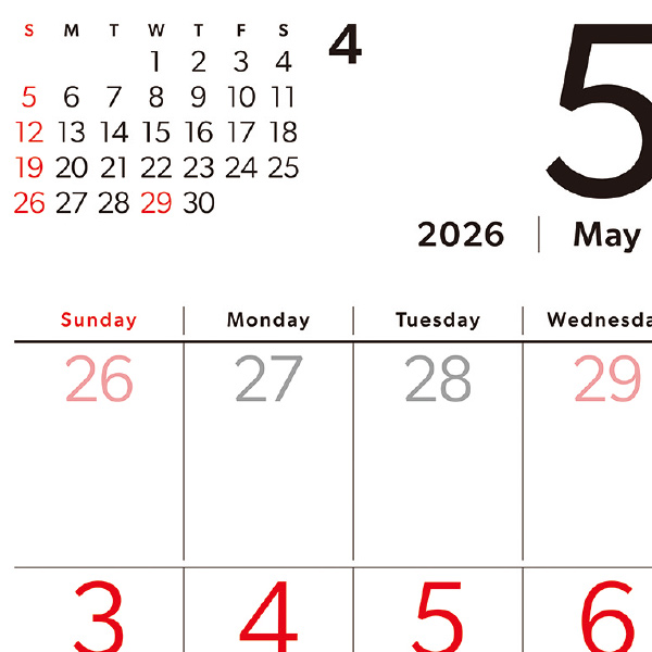 シンプルな書体で見やすさ抜群!見やすい日曜祝日の赤色を採用しました。