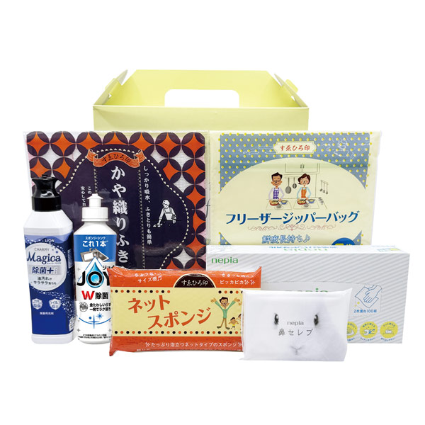 キッチンタオル2ロール、食器用洗剤250ml、メラミンスポンジ、フリーザーバッグ2枚入、水切りネット2枚入、お掃除シート20枚入、キッチンパック16枚入