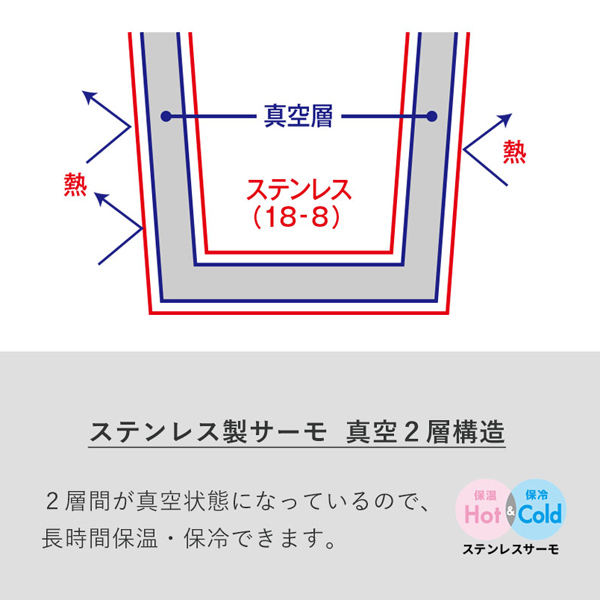 保温保冷に最適なステンレス素材を使用。2層間が真空状態になっているので、長時間保温・保冷できます。