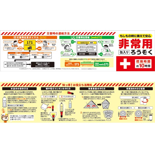 災害用伝言ダイヤルや水道水の保存方法、懐中電灯ランタンの作り方など、