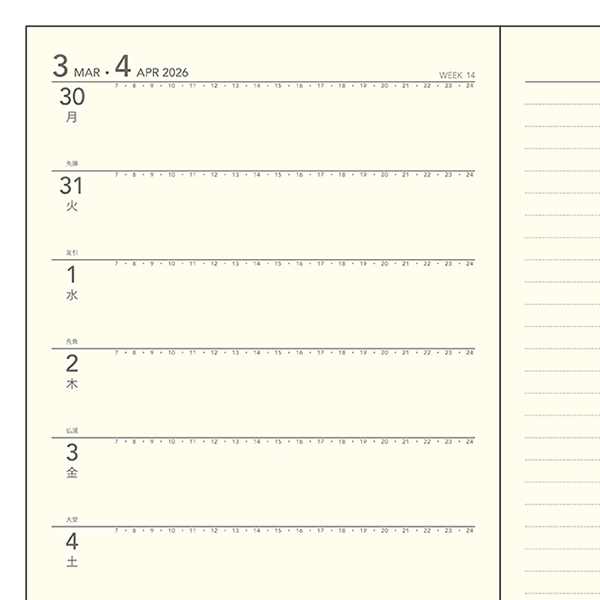 1週間の予定表とフリースペースのメモが見開きで確認できる人気のデザインです。