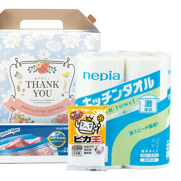 消耗品としてよく使用するフリーザーバッグ、キッチンタオルに、汚れを落とすメラミンスポンジが入っているため、貰っても困りません。