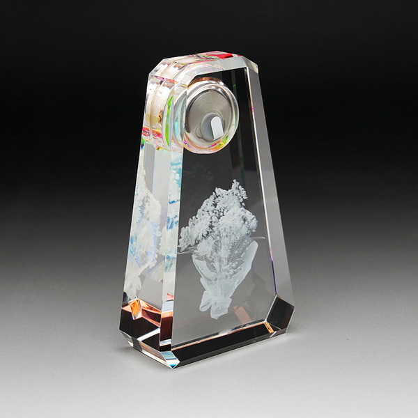 カラーやグラデーション等の表現は出来ませんが、クリスタルを物理的に削りますので、彫刻内容が濃く見え独特の美しさがあります。