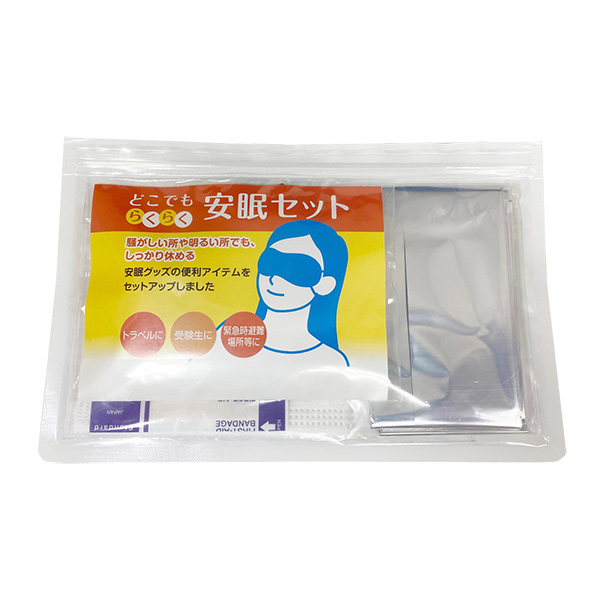 アイマスク、耳栓、防寒アルミブランケット、マスク×1、絆創膏Mサイズ×2、両軸綿棒×2