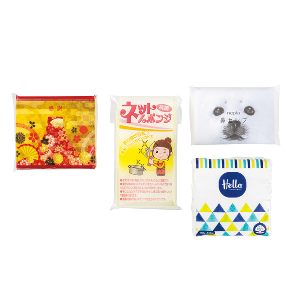 P&G除菌ジョイコンパクト170ml(さわやか微香)×1、ハローハーフサイズソフトパックティッシュ180W×1、ネットスポンジ×1、感謝ポケットペーパータオル10W×1、ネピア鼻セレブポケットティシュ12W×1