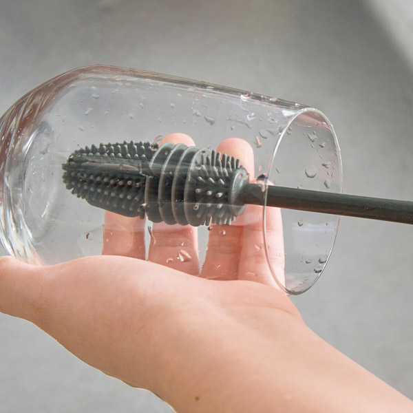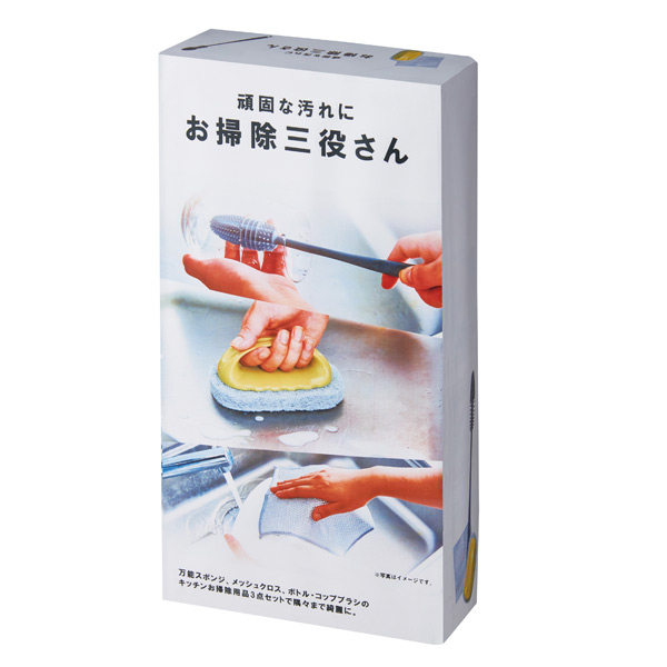 ハンドル付きでしっかりこすれる万能スポンジ、グラスやボトルの底まで届くボトル・コップブラシ、拭き上げに欠かせないメッシュクロスの三点セットを化粧箱に納めました。