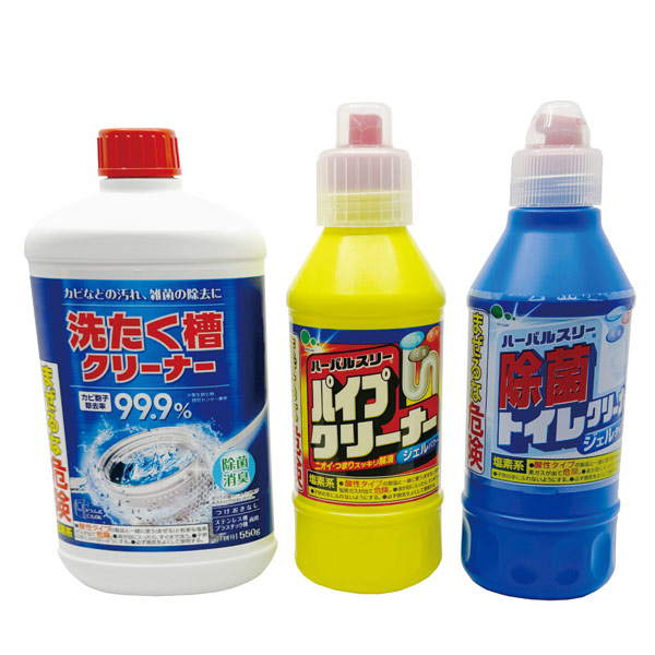 泡キッチンブリーチ400ml×1、カビとりスーパーハイパワー400ml×1、洗たく槽クリーナー550g×1 、ハーバルスリーパイプクリーナーS400ml×1 、ハーバルスリー除菌トイレクリーナー400ml×1