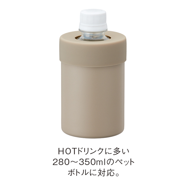ホットドリンクに多い280から350mlのペットボトルに対応しており、ラバーキャップでペットボトルをしっかり固定できます。