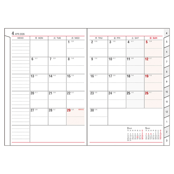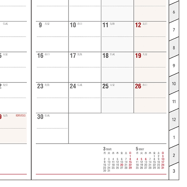 ※毎月の予定表の間に横罫が4Pずつ入ります。