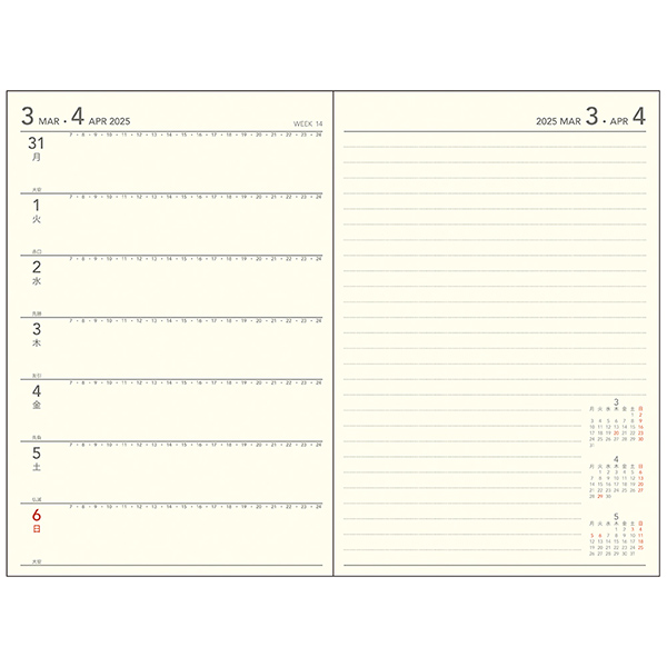 週間予定表の各ページには前月・当月・次月と3ヶ月分のカレンダーが付いています。