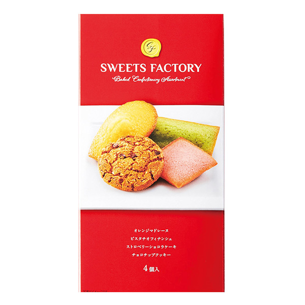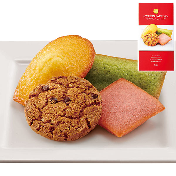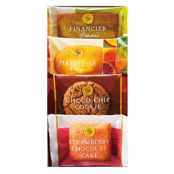 オレンジマドレーヌ×1、ストロベリーショコラケーキ×1 、ピスタチオフィナンシェ×1、チョコチップクッキー×1
