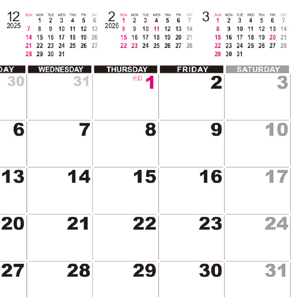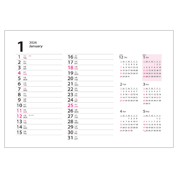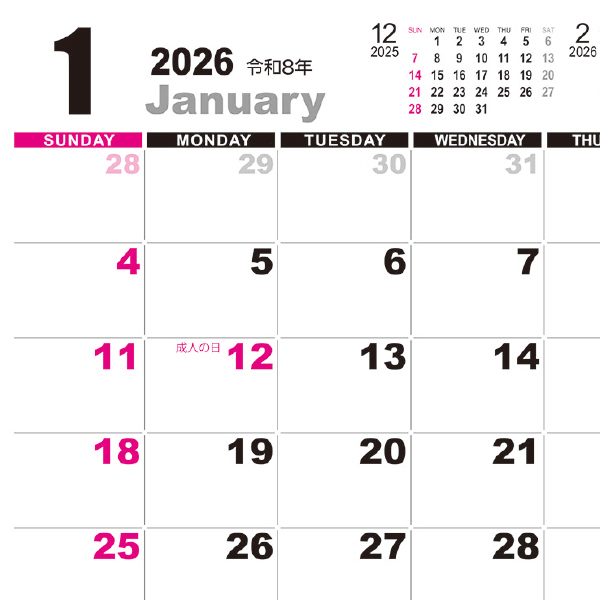 前後4か月表記と、広めの書き込みスペースで予定の管理にも便利です。