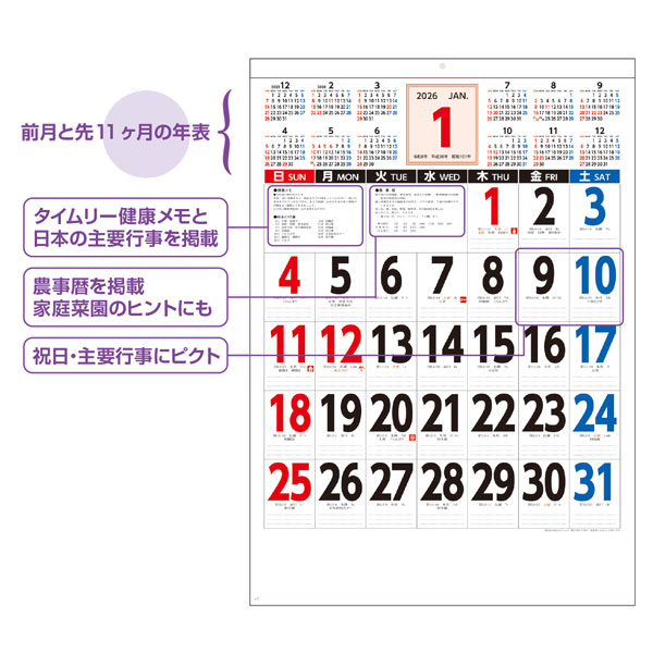 前月1ヶ月と後月11ヶ月を掲載し、先々の予定も確認しやすい仕様に。
