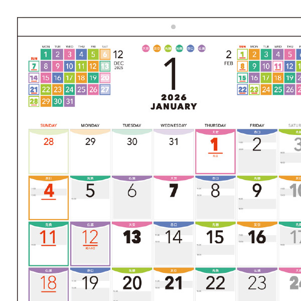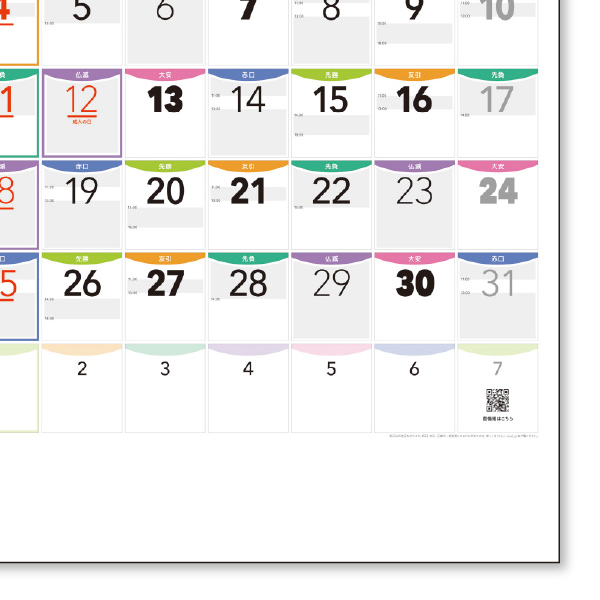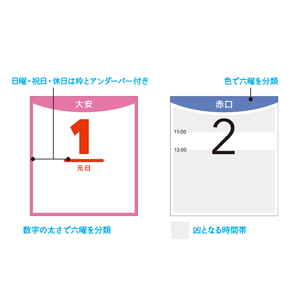 日曜・祝日・休日は枠とアンダーバー付きで、数字の太さとカラフルなカラーで六曜を分類。