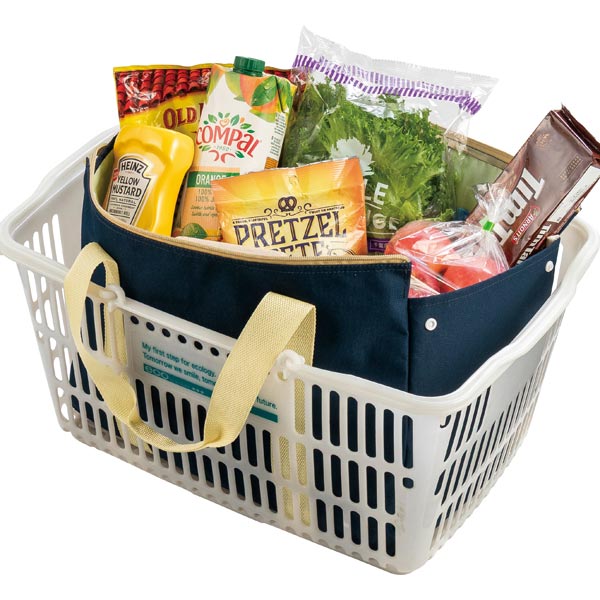 サイドボタンを外しマチを広げればレジカゴにも。