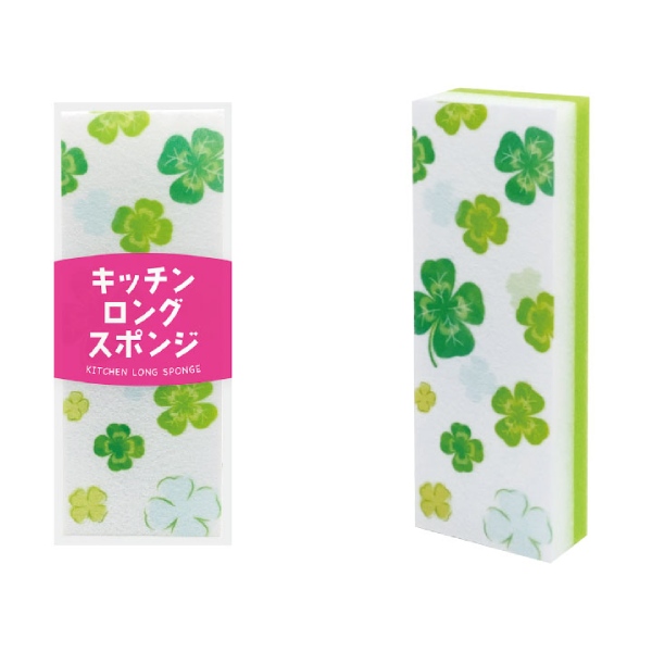 四つ葉のクローバー柄がかわいいスポンジは、 ロングタイプなので細長いグラス等を洗うのに便利です。