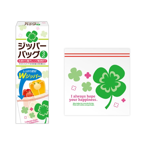 四つ葉のクローバーデザインのジッパーバッグは、汁モレも安心な「Wジッパー」仕様!