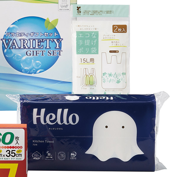 アイラップ60枚、エコ手提げポリ袋2枚、ハローキッチンペーパー70枚、洗って使える!不織布クロス1枚