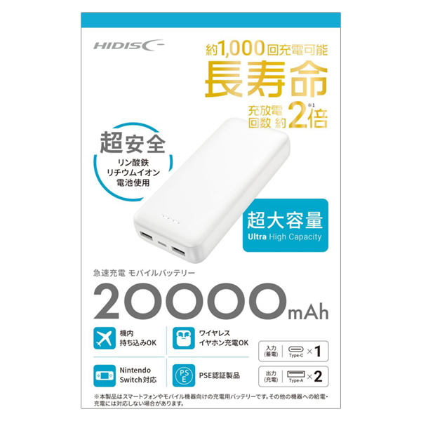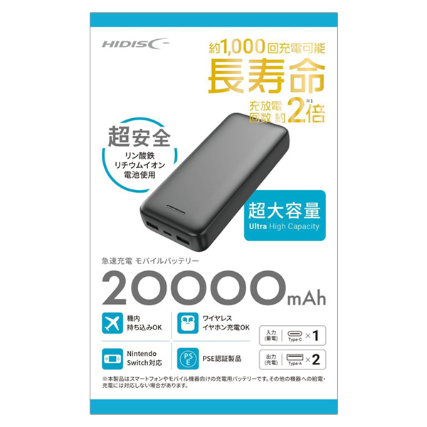 品番:122001 HIDISC リン酸鉄リチウムイオンモバイルバッテリー20000mAh