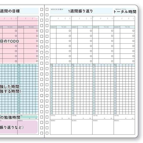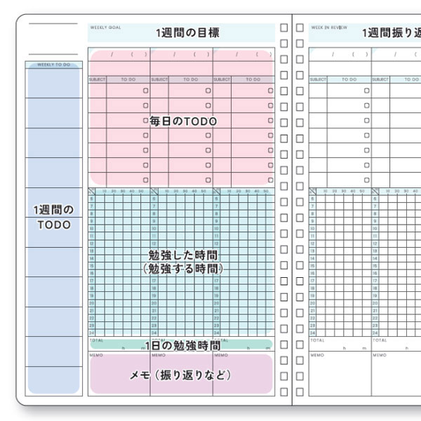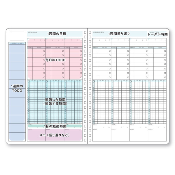 TODOリストや1週間の目標設定欄も揃っており、学習効率を高めたい人に最適です。