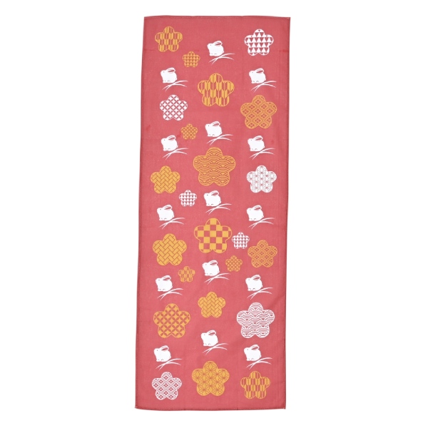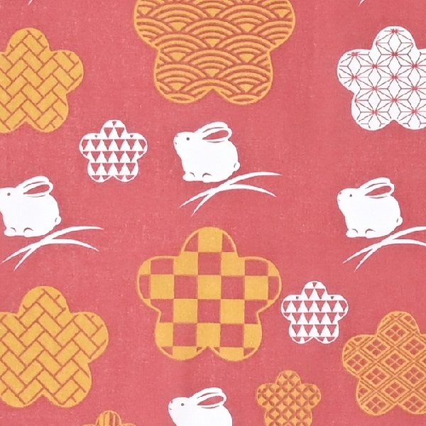 赤地に、白うさぎと梅型の和柄文様がちりばめられた可愛らしいデザイン。
