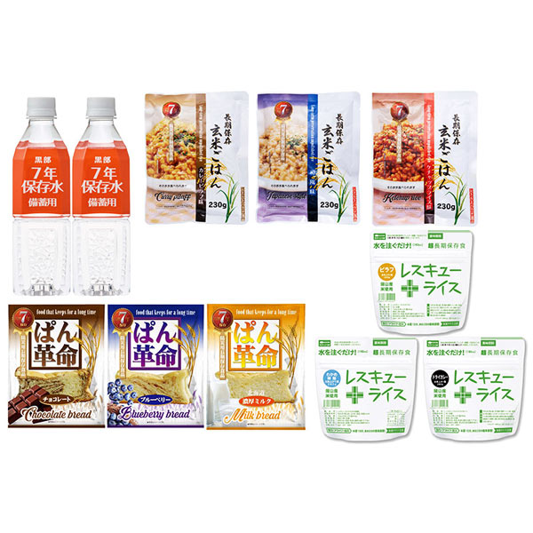 7年保存500ml×2本、ぱん革命・チョコレート×1袋、ぱん革命・ブルーベリー×1袋、ぱん革命・北海道濃厚ミルク×1袋、長期保存玄米ごはん カレーピラフ×1袋、長期保存玄米ごはん 和風味×1袋、長期保存玄米ごはん ケチャップライス×1袋、レスキューライス・わかめご飯×1袋、レスキューライス・ピラフ×1袋、レスキューライス・ドライカレー×1袋