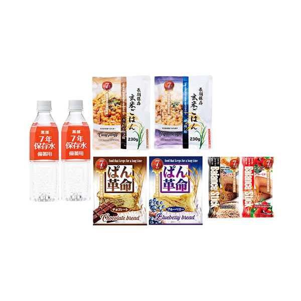7年保存500ml×2本、ぱん革命・チョコレート×1袋、ぱん革命・ブルーベリー×1袋、長期保存玄米ごはん カレーピラフ×1袋、長期保存玄米ごはん 和風味×1袋、バランススティック・セサミエスプレッソ×1袋、バランススティック・スイートストロベリー×1袋