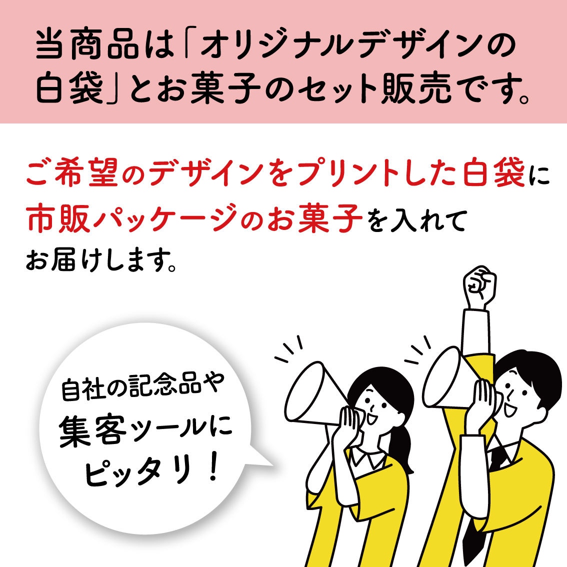 ご希望のデザインをプリントした白袋に、市販パッケージのお菓子を入れてお届けします。