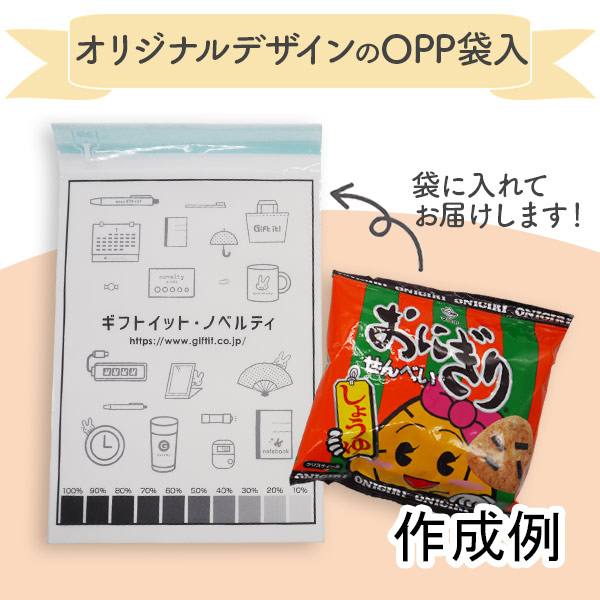 ご希望のデザインをプリントした白袋に、市販パッケージのお菓子を入れてお届けします。