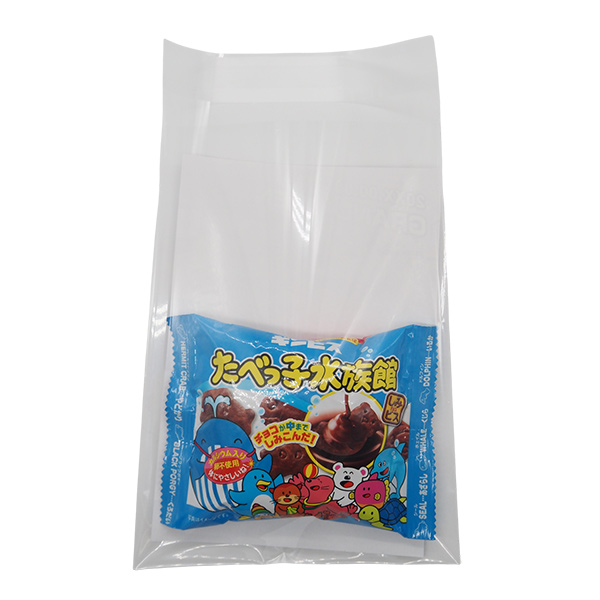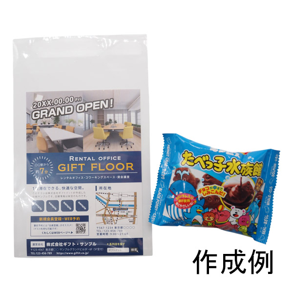 オリジナルデザインのB6チラシと市販パッケージのお菓子を
