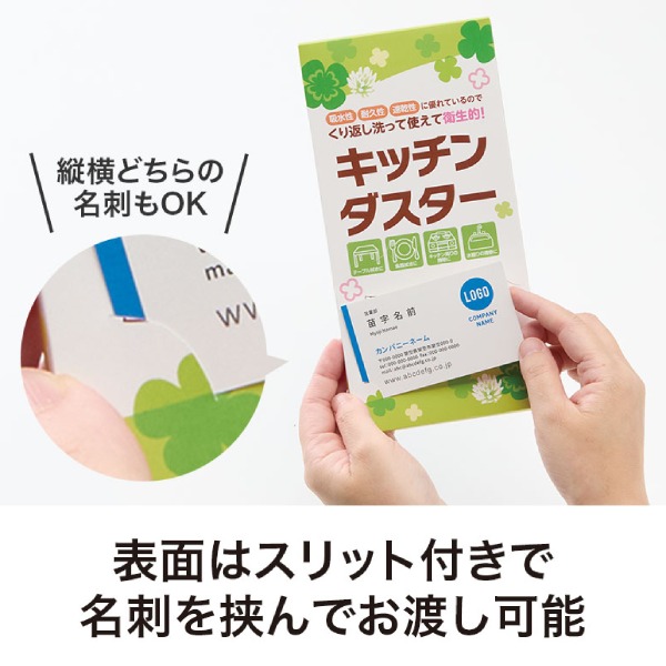 パッケージには名刺やショップカードを挟めるスリット付きとなっているため、お渡し用ノベルティとしても印象に残るアイテムです。