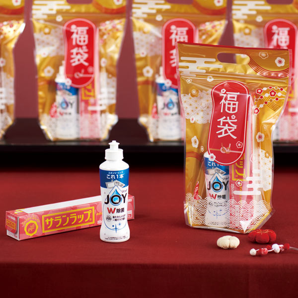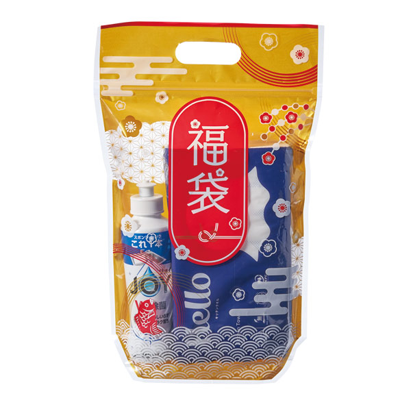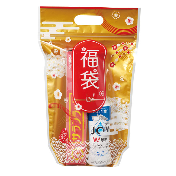 ハローキッチンペーパー70枚、ジップロックフリーザーバッグM3枚、アイラップ60枚、サランラップ22cm×15m、除菌JOYコンパクト×各12個、めで鯛スタンド福袋×60枚