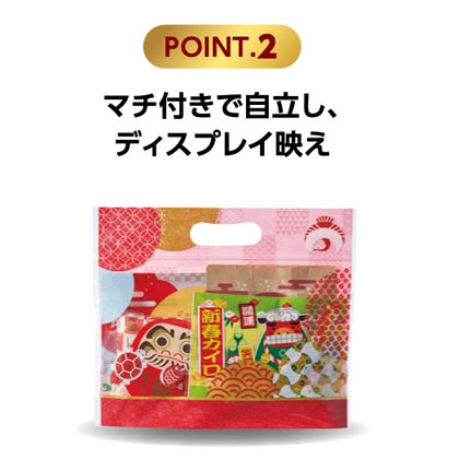・マチ付きで自立し、店頭での陳列などで目立ちます。