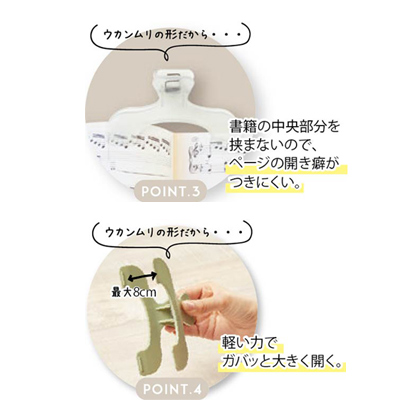軽い力でガバっと最大8cm開き、本やノートに挟みやすく、ページの開き癖もつきにくいデザインを採用。