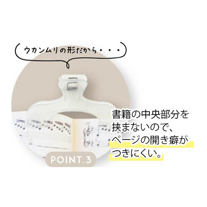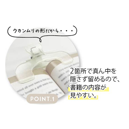 ページの中央や背表紙を避けて留められるデザインで、開き癖がつきにくいのが特徴のブックストッパーです。