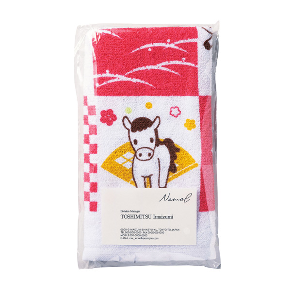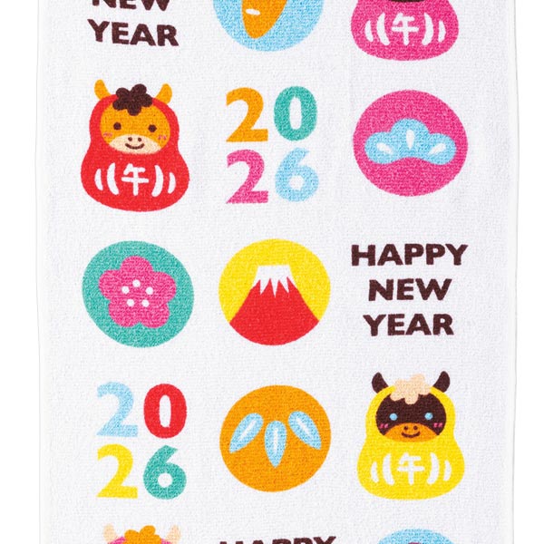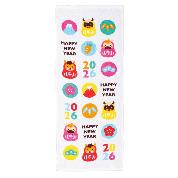 幅広く喜んでもらえるポップなデザインです。来店粗品などおすすめなお年賀タオルです。