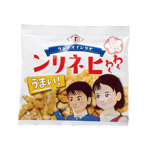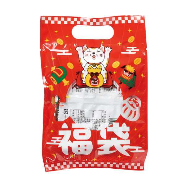 招き猫や獅子舞など縁起の良い絵柄が盛りだくさんのパッケージに駄菓子が4点入っています。