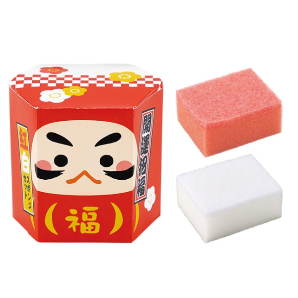 おめでたい紅白カラーのスポンジを、だるまデザインのパッケージに入れて1個セットにしました。