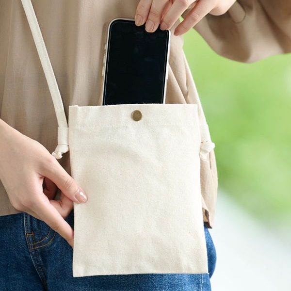 10オンスの丈夫なコットン素材で、スマホや小物を安心して持ち歩けます。