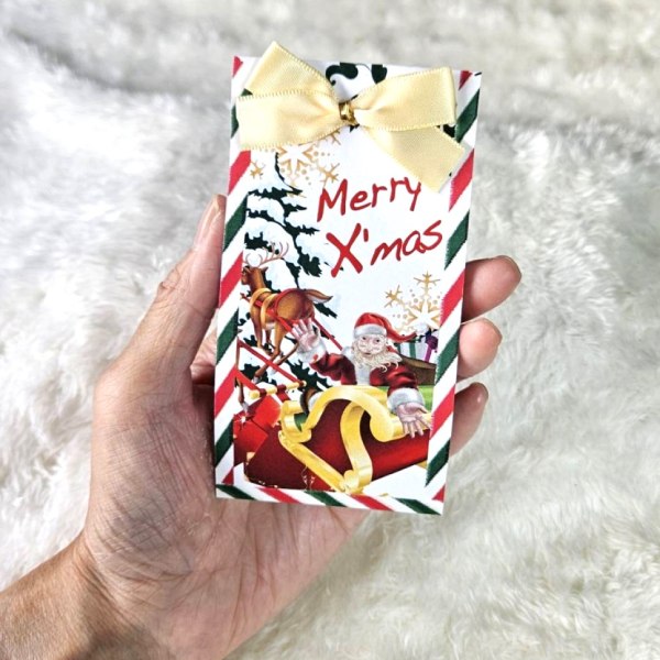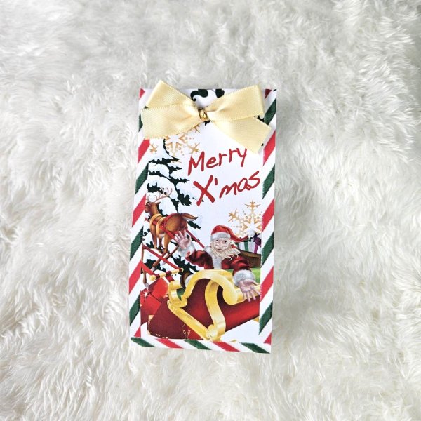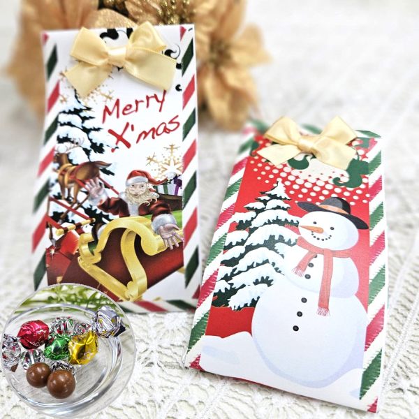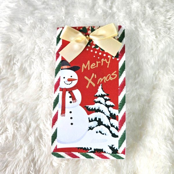 愉快なサンタとスノーマンがクリスマスを彩り、ゴールドのリボンが華やかに演出します。