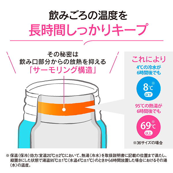 ※保冷効力:室温約20度において製品に冷水を取扱説明書に記載の位置まで満たし、ふたをつけて縦置きにした状態で水の温度が約4度のときから所定の時間放置した場合におけるその水の温度。