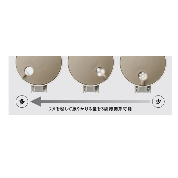 振りかけモードは、フタを回して穴のサイズを3段階に調整可能。調味料の粒のサイズに合わせたり、振りかけ量の調節ができます。