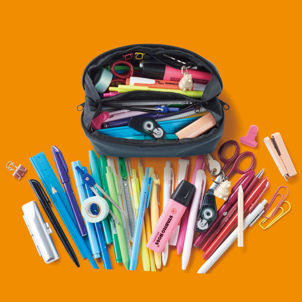 ペン類×23本、ハサミ×1本、カッター×1本、ホチキス×1個、マスキングテープ×2個、修正テープ×1個、コンパス×1個、定規×1個、フセン×4個、クリップ×10個、印鑑×1個、カギ×1個