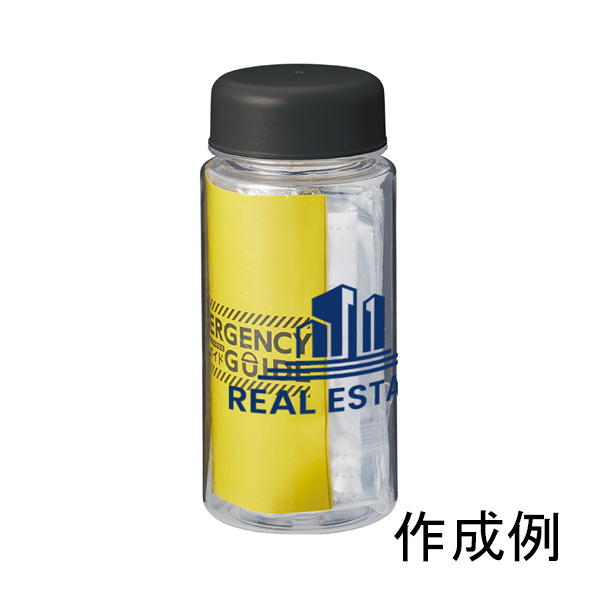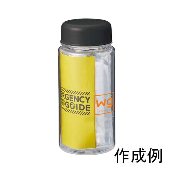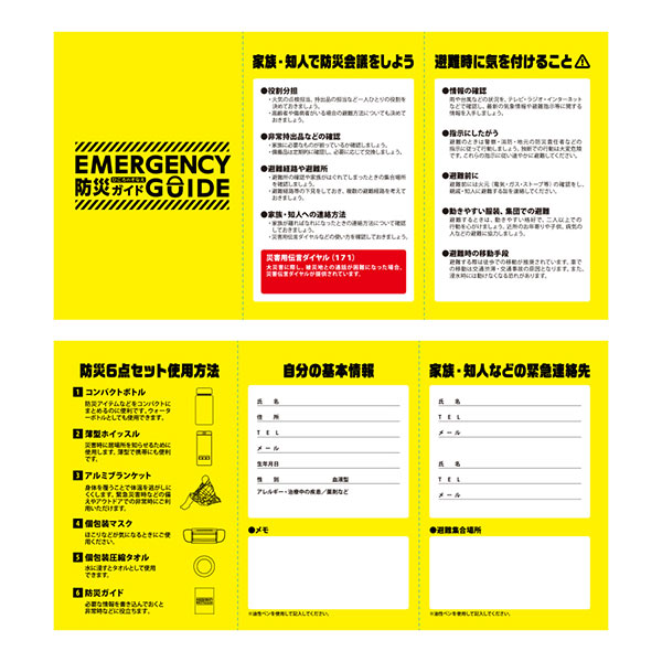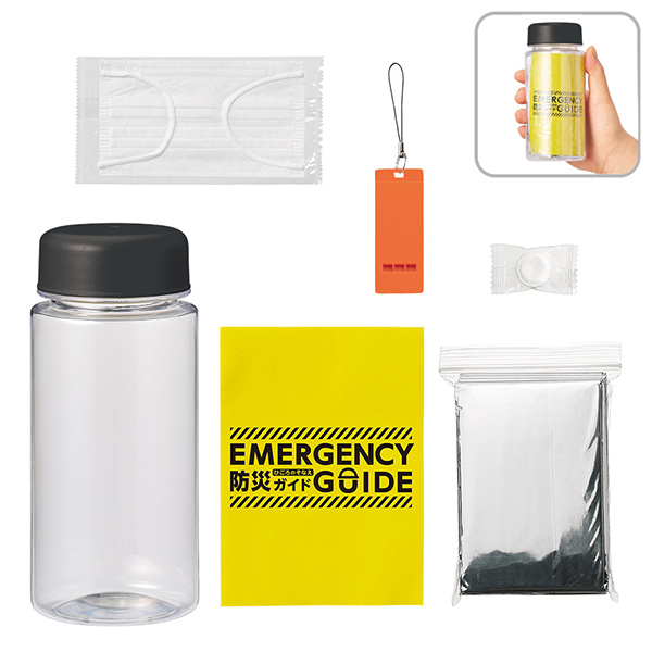 - ■材質: ボトル/PS・PP、ホイッスル/ABS 他、アルミブランケット/アルミ蒸着PET、圧縮タオル/レーヨン、マスク/不織布(PP)他、防災ガイド/紙