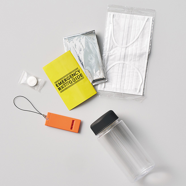 ボトル、薄型ホイッスル、アルミブランケット、個包装マスク、圧縮タオル(薄手)、防災ガイド