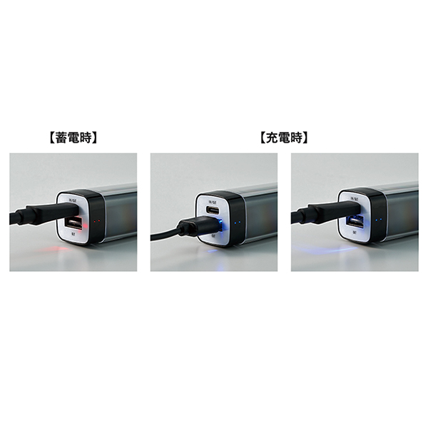 蓄電中は赤ランプが光り、充電中は青ランプが点灯する仕様で、Type-Cのケーブル付き。