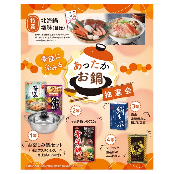 豪華な北海鍋の目録を特賞に、鍋つゆ・豆腐・スープなど、冬の食卓に嬉しいアイテムが勢揃いしています。